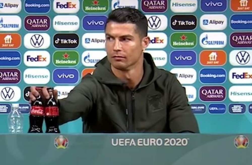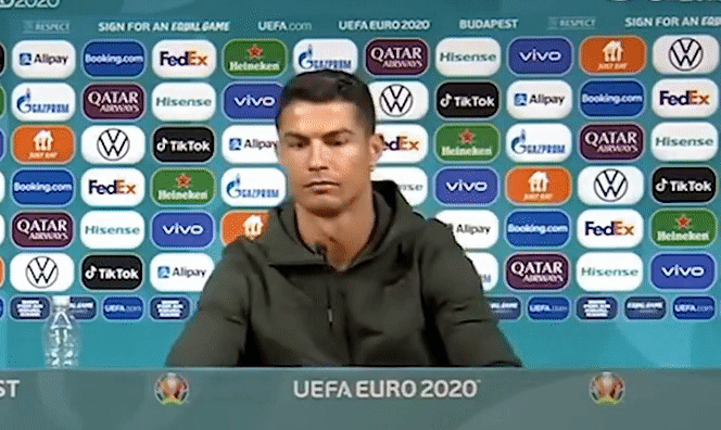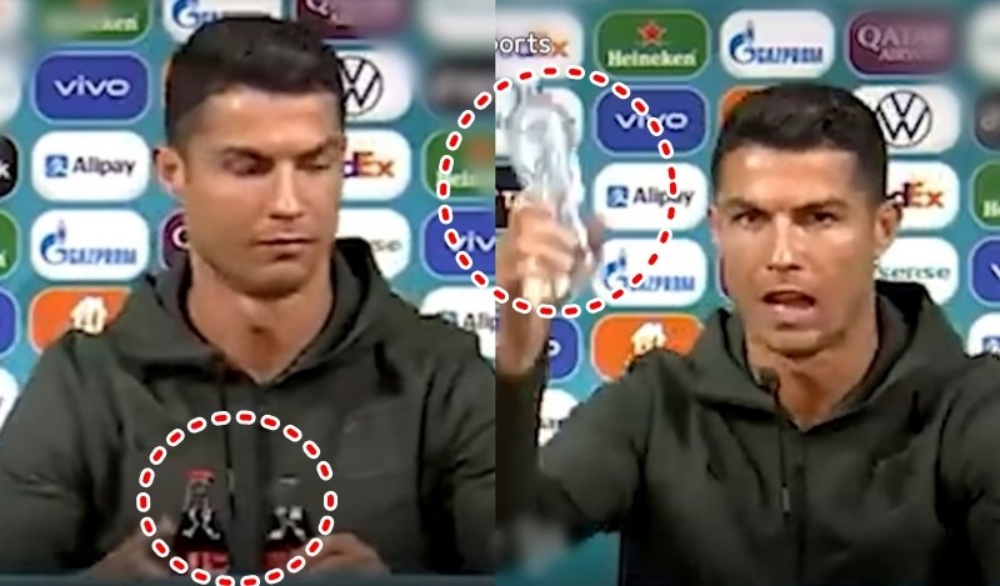 대회의 공식 스폰서 코카콜라를 밀어낸 호날두의 행동에 당황한 기자들이 의아하다는 표정을 짓자 호날두는 구석으로 치운 콜라 대신 생수병을 손에 들고 포르투갈어 "Agua"라는 말로 콜라 대신 물을 마시라는 메시지까지 덧붙였는데요.