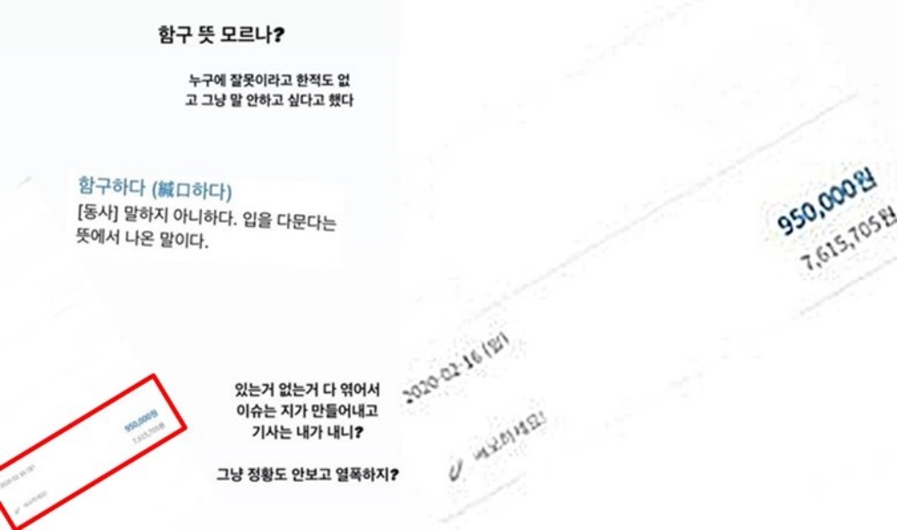 송다예가 공개한 폰 앨범 캡처본에 대한 이슈가 커지자 "있는 거 없는 거 다 엮어서 이슈는 지가 만들어내고 기사는 내가 내니"라며 "그냥 정황도 안보고 열폭하지"라고 불쾌감을 드러냈습니다. 그러면서 의미를 알 수 없는 입금 내역 1건을 함께 공개해서 궁금증을 높였습니다.