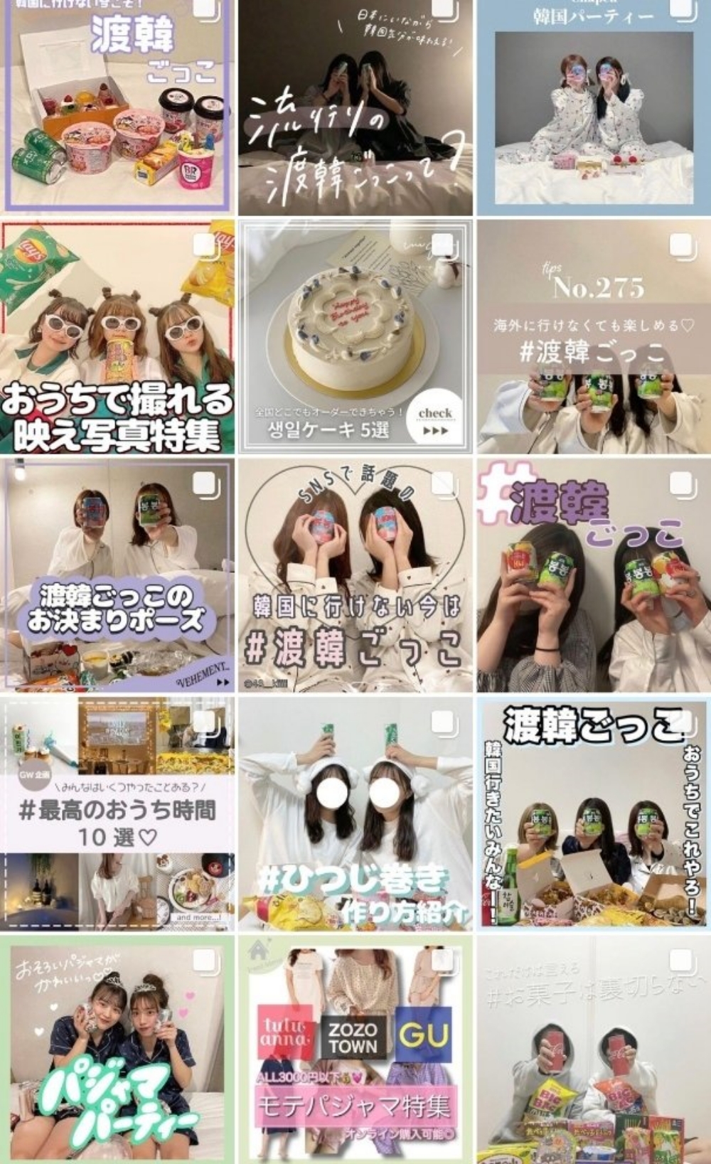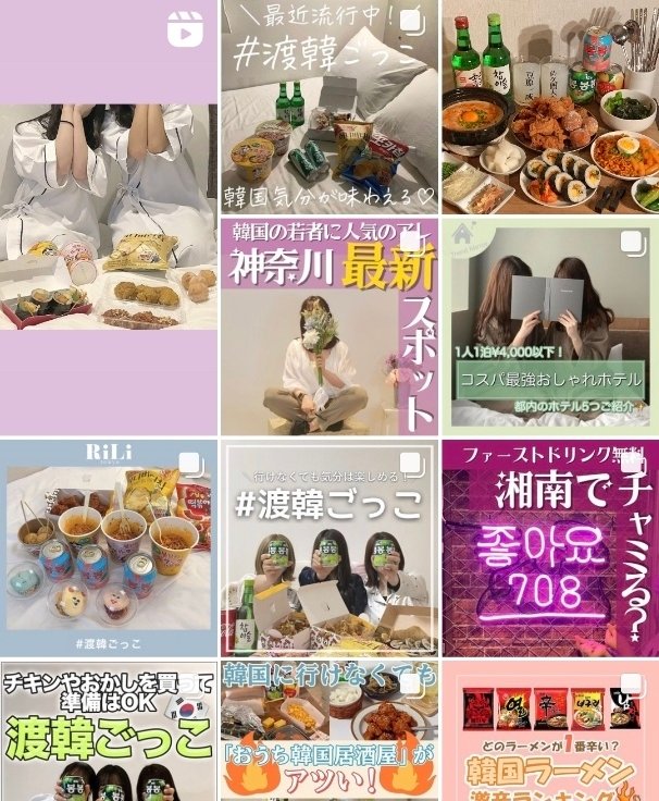 실제로 인스타그램에 #渡韓ごっこ라는 해시태그를 검색하면 일본의 Z세대가 게시한 한국여행놀이 인증샷이 끊임없이 이어집니다. 해당 인증샷에는 치킨, 떡볶이, 김밥, 라면 등 한국 음식과 소주, 사이다와 같은 한국 음료들이 보입니다.