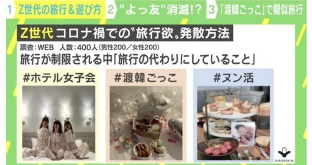 지난달 28일 일본 언론에서는 '渡韓ごっこ(한국여행놀이)'라는 신조어가 등장했습니다. 마케팅 회사 '시부야109랩'에서 '코로나 기간의 여행 및 놀이 문화'를 주제로 진행한 설문조사 결과 일본의 Z세대 사이 유행 중인 여행 트렌드 중 하나가 '한국여행놀이'라는 것.