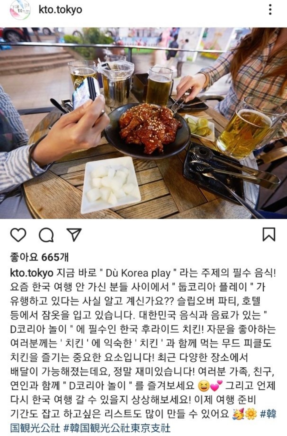 이처럼 '한국여행놀이'가 하나의 트렌드로 주목받기 시작하자 한국관광공사 도쿄지사는 SNS를 통해 "한국 치킨은 한국여행놀이에서 뺄 수 없는 음식"이라고 소개했습니다. "호캉스나 파자마파티를 즐길 때 어디서나 배달이 가능한 한국치킨을 주문해 먹으면서 언제 다시 한국 여행을 갈 수 있을지 상상해보라"라고 권했지요.