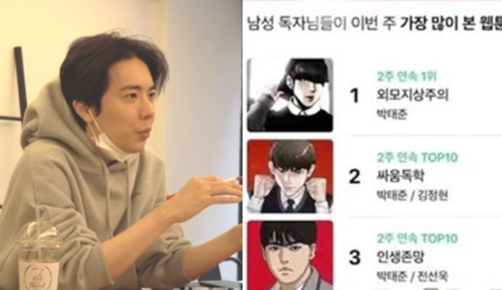 2014년부터 7년째 연재 중인 웹툰 '외모지상주의'가 금요웹툰 인기순위에서 1위를 놓치지 않는 데다 지난해 완결한 '인생존망'에 이어 새롭게 내놓은 작품 '싸움독학' 역시 흥행대박을 터뜨린 웹툰작가 박태준은 그야말로 스타작가인데요. 외모지상주의, 인생존망, 싸움독학이 동시에 연재되던 지난해에는 작품 3개가 모두 TOP20에 들어갔기에 단순 계산하면 "17억 X 3 = 51억"이라는 놀라운 수익까지 가능했던 셈.