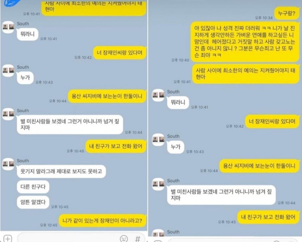 이미 끝난 사이인데 소속사에서 결별설을 못 내게 막고 있다는 남태현의 말을 믿기로 한 A씨는 그 이 후 남태현과 장재인이 영화관에서 만나고 있다는 친구의 전화받게 됩니다. 이를 남태현에게 따지게 되었고 남태현은 '장재인이랑 애매해'라며 장재인과의 관계를 부정하였습니다. 이를 계기로 A씨는 인스타 DM으로 장재인에게 카톡 캡쳐와 함께 남태현의 양다리에 대해 제보를 하게 되고, 장재인은 이를 공개하므로서 본인과 A씨를 농락한 남태현의 숨겨진 본 모습을 세상에 알렸습니다.