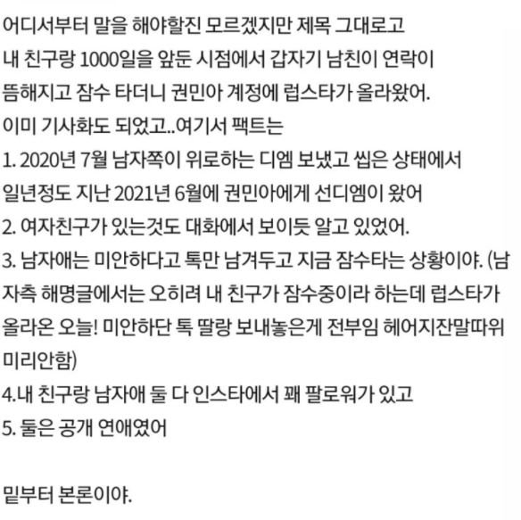 권민아는 지난 6월 자신의 인스타그램에 한 남성과 찍은 사진을 공개하면서 양다리 논란은 시작되었습니다. 그 당시 권민아는 그 남성과의 열애 사실을 인정하였습니다. 하지만 권민아 남자친구가 또 다른 일반인 여자친구를 사귀던 중 권민아를 만났다는 사실을 폭로하는 글이 한 커뮤니티에 올라 왔습니다.