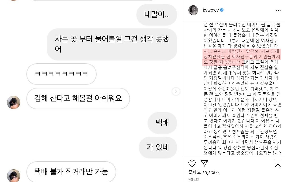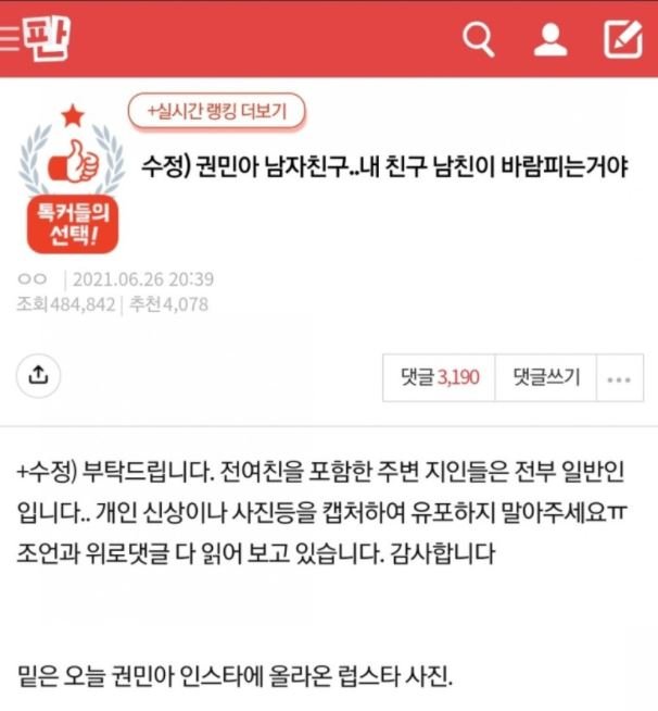 결국 권민아는 인스타그램에 장문의 글을 통해 양다리 논란을 인정하고, 남자친구의 전 여자친구에게 사과를 했습니다. 그리고 남자친구와는 결별했다고 밝혔습니다.