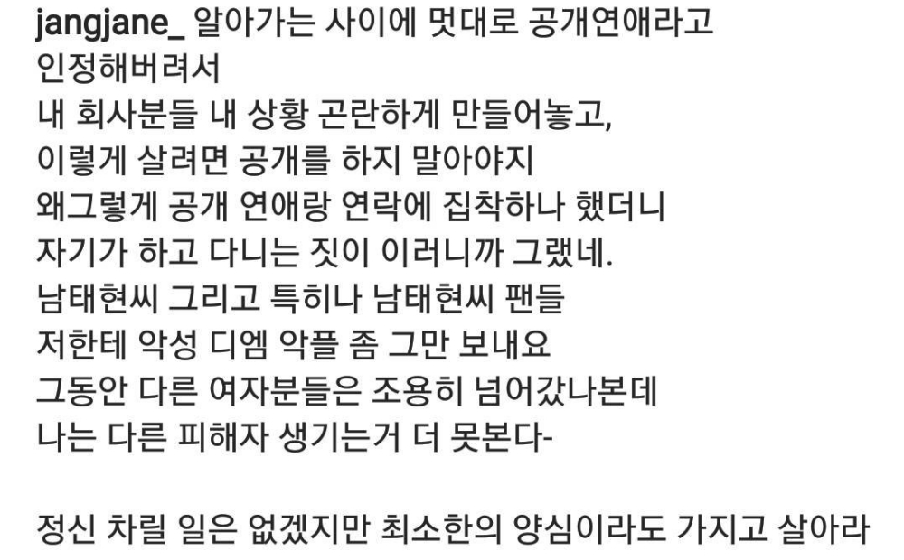 이어서 장재인은 다른 게시물을 통해 남태현과의 열애 공개 당시 난감했던 처지를 밝히며 남태현에게 '정신 차릴 일은 없겠지만 최소한의 양심은 갖고 살아라'라며 일침을 놓기도 했지요.