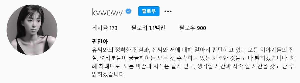 권민아는 최근 자신의 인스타그램 프로필에 "유씨와의 정확한 진실과, 신씨와 저에 대해 알아서 판단하고 있는 모든 이야기들의 진실, 여러분들이 궁금해 하는 모든 것, 추측하고 있는 사소한 것들도 다 밝히겠다"고 글을 올리며 또 다시 폭로를 예고했습니다. 위의 글에 언급된 '유씨'는 양다리 논란이 있던 전 남자친구, '신씨'는 AOA 리더 신지민을 지칭하는 것으로 보입니다.