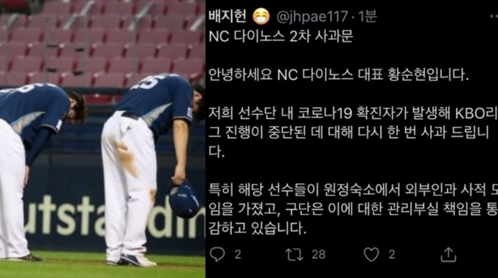 최근 한국 프로야구 내 코로나19 확진자가 쏟아진 경위와 관련해 팬들의 실망이 이만저만이 아닙니다. 지난 5~7일 NC 선수단이 원정 숙소로 사용한 강남의 한 호텔에서 8일 코로나 확진자가 발생했고, 이에 따른 진단 검사에서 NC 선수 3명이 확진되었는데요. 이후 NC를 상대로 경기를 치른 두산베어스 선수단에서도 확진자가 나오면서 리그가 중단되는 초유의 사태가 벌어졌습니다.