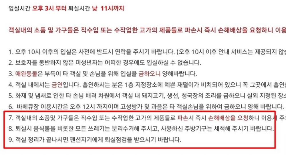 또 "퇴실시간도 언제부턴가 11시로 바꿔놓고 아침에 부랴부랴 정리하고 나가기 바쁜데 모든 쓰레기까지 내놓고 싹 치우고 가라는 건 어이없다. 비싼 돈 내고 청소까지 손님이 하는 건 충분히 잘못된 듯", "입실하면 안내문이 A4 몇 장이 되는 곳도 있고, 체크아웃 시 선생님께 청소 검사받듯이 사장이 보는 곳도 있고, 보증금 있는 곳도 있다. 거의 장소만 제공하고 예약 대행업체 수준"이라면서 투숙객에게 책임을 부담시키는 시스템에 대해 비판했는데요.