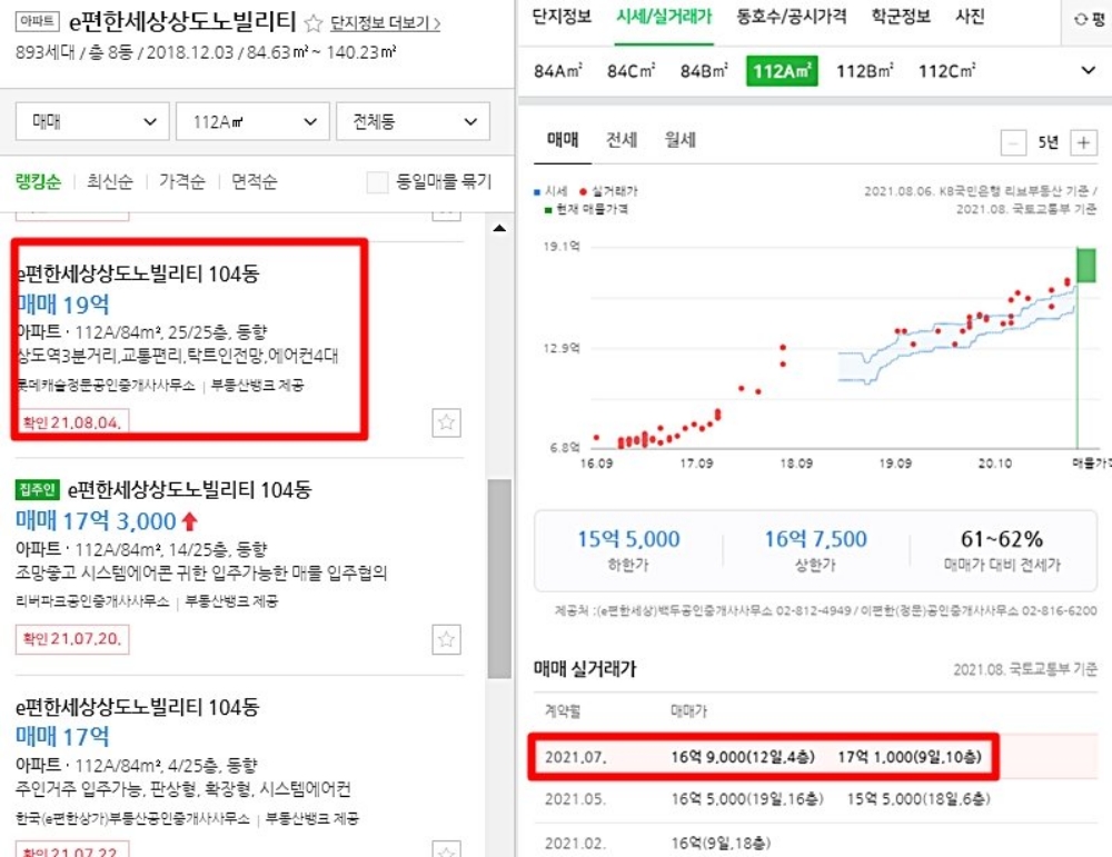 그렇다면 입주한 지 2년 반여가 지난 현재 이시언 아파트의 가격은 얼마일까? 국토교통부 공시자료에 따르면 지난 7월 거래된 e편한세상 상도노빌리티의 112㎡의 실거래가는 4층이 16억 9천만 원, 10층이 17억 1000만 원입니다. 현재 매물 중 고층은 19억 호가를 기록한 것도 있는데요.