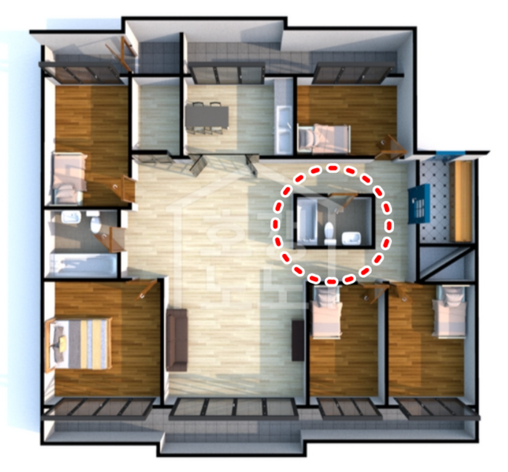 화장실이 가운데 배치되면서 불필요한 공간 낭비 역시 줄일 수 있었습니다. 화장실이 들어갈 벽면 자리가 비면서 서비스 면적인 베란다를 늘릴 수 있었고 방 크기와 창의 면적 역시 늘릴 수 있었는데요. 다만 화장실에 창문이 없다 보니 환기와 습도 조절이 어려운 점은 큰 단점입니다. 또 물소리가 거실에 들리는 것도 불편함으로 지적되죠.