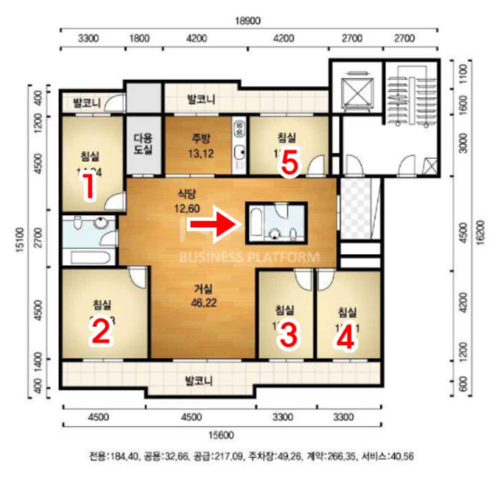 대형 평형인 해당 타입은 설계 당시 대가족을 겨냥해서 지어졌습니다. 당시만 하더라도 24~25평의 소형평수가 인기였고 4인 가족 기준 33~34평보다 큰 평형을 원하는 경우가 드물었는데요. 때문에 약 65평에 해당하는 해당 타입은 대가족을 겨냥해서 침실을 5개나 배치했습니다.