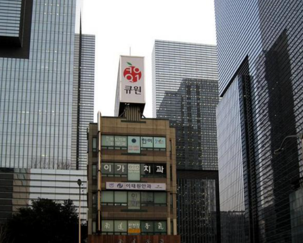 삼성타운과 불과 15m 간격을 두고 있는 윤빌딩은 '삼성 스카이라인 사이 초가집', '알박기 빌딩', '미운오리새끼 빌딩'이라는 비아냥을 들으면서도 유명세를 탔습니다. 삼성의 정문을 지키는 아이러니한 비주얼과 더불어 삼성타운이 만든 서초동 경제 일번지의 최대 수혜자가 된 셈인데요.