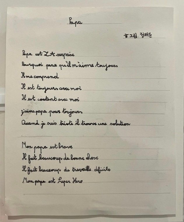 한편 아버지의 살뜰한 예절교육을 받으며 자라고 있는 쌍둥이 남매는 얼마 전 정 부회장의 생일을 맞아 정성스러운 생일카드를 선물했습니다. 해준 군은 '우리 아빠'를 제목으로 멋진 시를 써서 선물했고 해윤 양은 불어로 풀어낸 시를 필기체로 멋지게 적어 눈길을 끌었습니다.