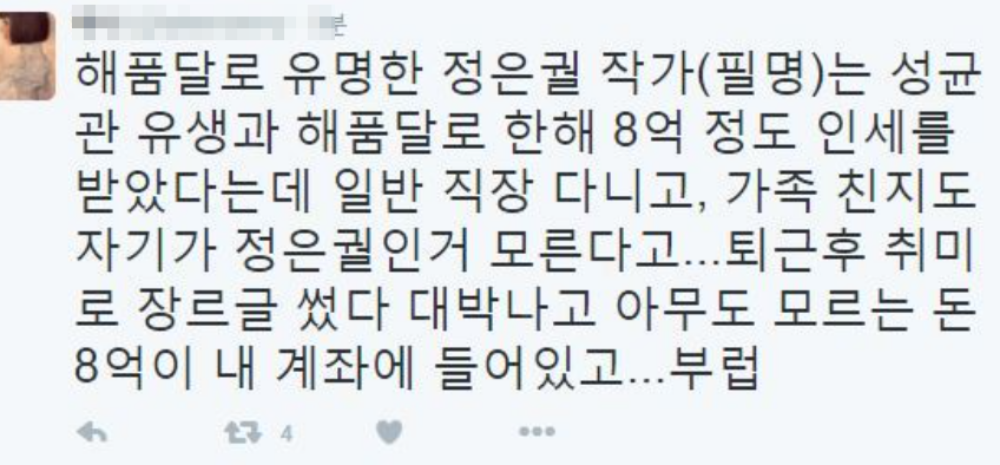 심지어 해품달 열풍이 전국을 휩쓸던 2012년에도 가족과 지인 모두에게 비밀로 했다는 정은궐 작가는 당시 한 언론사와의 비대면 전화 인터뷰를 통해서 "내 생활이 중요하고 변화가 생기는 게 싫다"라는 확고한 신념을 전했습니다. 이어 "가족들도 모르냐"라는 질문에 "모른다. 내 주변에는 드라마 보는 사람이 별로 없다. 지인이나 직장 사람 사이에서 '해품달'이 화제가 된 것이 없다"라고 말했는데요. 작가로서 활동에 대해 "직장인이 일이 끝난 뒤 춤을 추고 운동하고 그런 취미 중의 하나라고 할까. 그런 수준이다"라고 확실한 선을 그었지요.