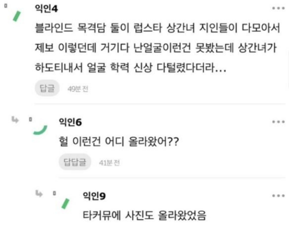 일부 커뮤티니 글에 의하면 '블라인드'를 통해' 이미 서주원의 외도사실에 대한 수많은 정황증거가 공개된 바 있다는 주장이 제기되고 있습니다. 서주원과 상간녀가 공공연하게 럽스타그램을 하는 바람에 상간녀의 지인들이 해당 사실에 대해 블라인드를 비롯한 각종 커뮤니티에 제보글을 올린 바 있다는 것인데요. 때문에 김민영은 '둘 사이를 나 빼고 다 알았다'라는 자괴감이 심했던 것으로 보입니다.
