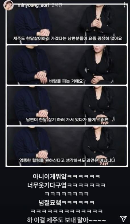 과거 서주원은 제주한달살기를 다녀온다고 밝힌 적도 있는데, 당시 김민영은 '제주 한달 살기를 가겠다는 남자는 바람을 핀다'라는 게시글을 공유하면서 "이걸 제주도를 보내 말아"라고 농담섞인 게시글을 올린 바 있습니다. 결과적으로는 농담이 현실이 된 안타까운 케이스인 셈이네요.