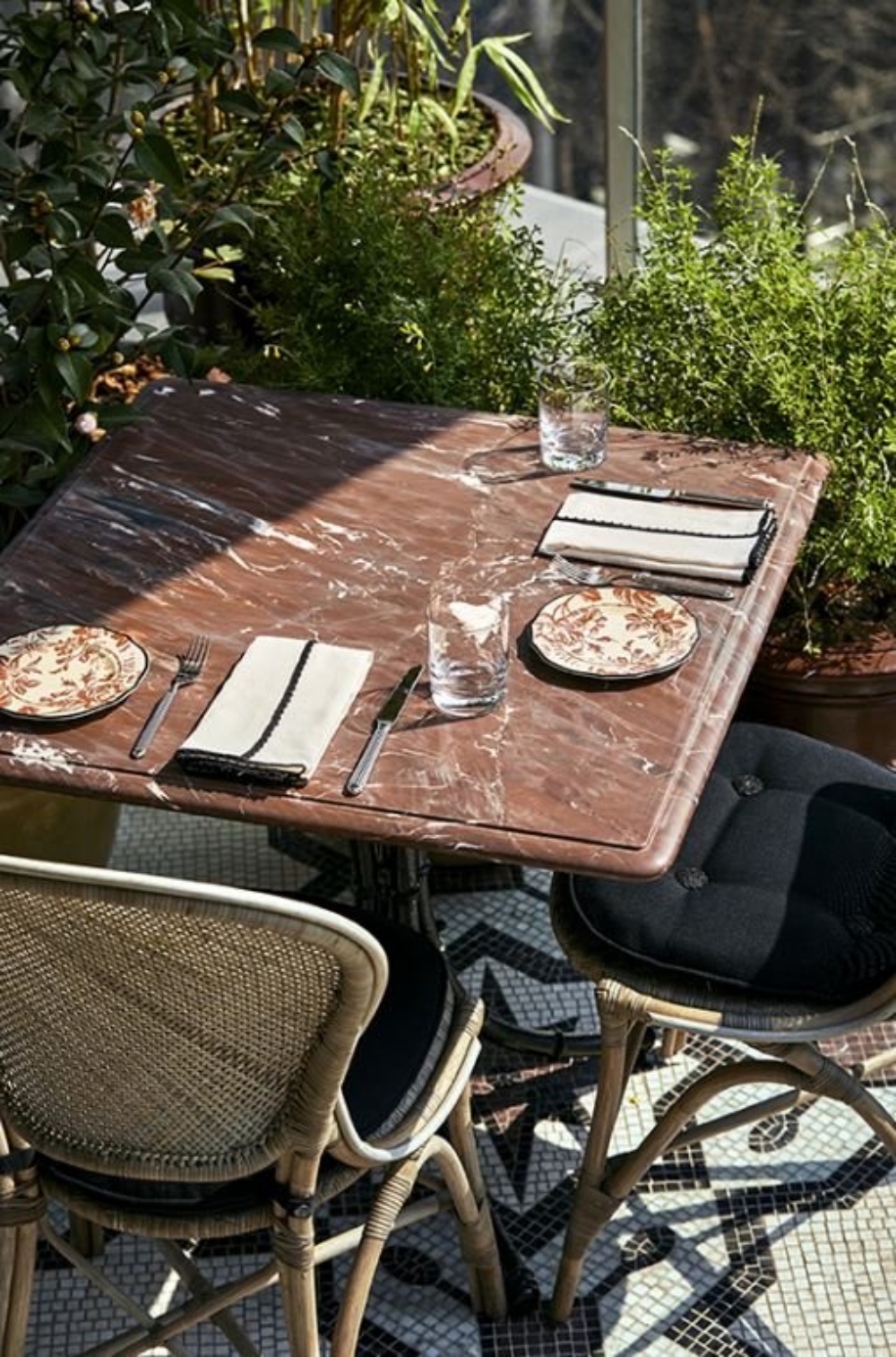 손님들은 입구에 들어서자마자 겨울 정원의 분위기를 자아내는 선명한 초록의 색감이 반하고 이어 구찌 오스테리아의 시그니처 인테리어인 별모양의 심볼이 새겨진 천장조명과 타일, 테라스 바닥에 한번 더 반한다고 하네요.