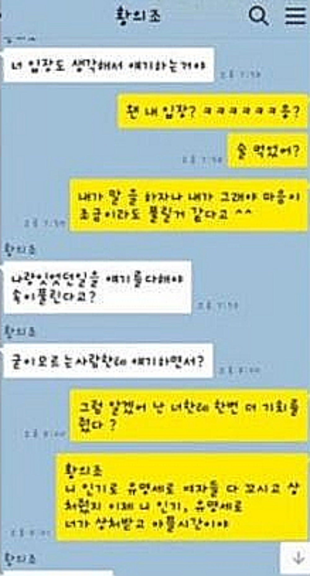하지만 얼마지나지 않아 황의조는 또 다른 여성과의 추문으로 논란이 되었습니다. 해당 여성은 카톡 대화창 일부를 직접 공개했습니다. 해당 메시지에는 황의조가 "6개월 만난 여자친구에서 논 거 다 걸렸다. 운동집중도 안되고 신경이 너무 쓰인다. 호기심으로 시작해서 결국 이렇게 됐다"라는 내용이 담겨 있었습니다.