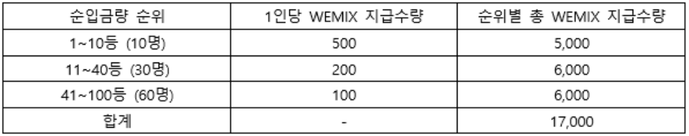 - 이벤트 내용: WEMIX 순입금량 순위에 따라 총 17,000 WEMIX 차등 지급
