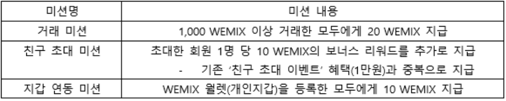 - 이벤트 내용: 달성에 성공한 미션의 WEMIX 리워드를 모두 합산하여 지급
