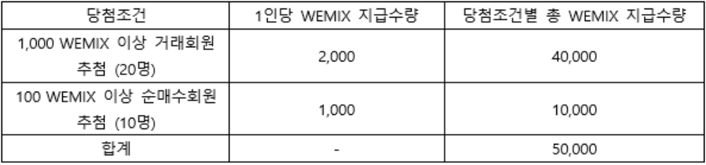 - 이벤트 내용: 하단 당첨조건에 참여 후 당첨된 회원에게 총 50,000 WEMIX 차등 지급