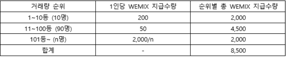 - 이벤트 내용: 거래량 순위에 따라 매일 8,500 WEMIX 지급(기간 중 총 263,500 WEMIX 차등 지급)