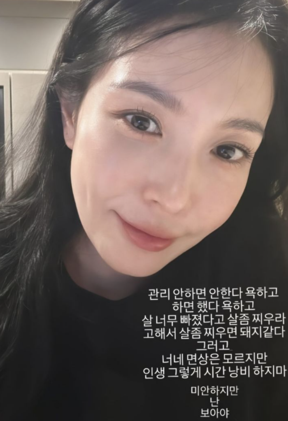 그는 "관리 안 하면 안한다고 욕하고 하면 했다고 욕하고 살 너무 빠졌다고 살 좀 찌우라고 해서 살 좀 찌우면 돼지같다 그러고"라고 적었습니다. 이어 "너네 면상은 모르지만 인생 그렇게 시간 낭비하지 마"라며 "미안하지만 난 보아야"라고 자신감을 드러냈습니다.