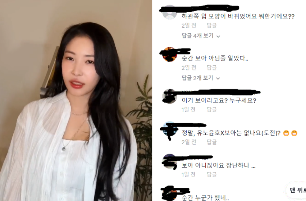 보아는 30일 방송하는 채널A 뉴스에서도 "공개된 삶을 살아야 하는 연예인들이 화풀이 대상이 되지 않기를 바란다"며 악성 댓글에 대한 고충을 털어놓은 것으로 알려졌는데요. 앞서 2월 종영한 드라마 '내 남편과 결혼해줘'에서 오유라 역으로 출연할 당시에도 보아는 입술이 어색하다는 반응에 대해 직접 해명한 바 있습니다.