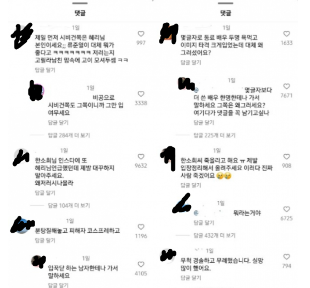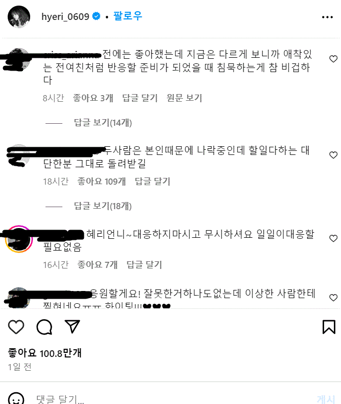 본인 피셜 성격급한 탓에 올린 한소희의 글 덕분에 혜리의 SNS는 난장판이 되었습니다. 혜리의 가장 최근 인스타그램 게시물에는 이번 사태에 대한 해명을 재차 요구하는 댓글이 쏟아졌습니다. 1만개를 넘어선 댓글에는 "몇 글자로 동료 배우 두 명 욕 먹고 이미지 타격 크게 입었는데 대체 왜 그랬냐", "한소희 씨 너무 힘들어한다. 제발 입장 정리해서 올려달라", "제일 먼저 시비를 건 쪽은 혜리 본인이다. 류준열이 뭐가 그렇게 좋냐"는 등 비난의 댓글이 쏟아졌습니다.