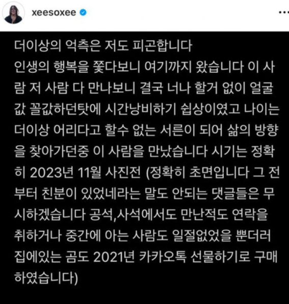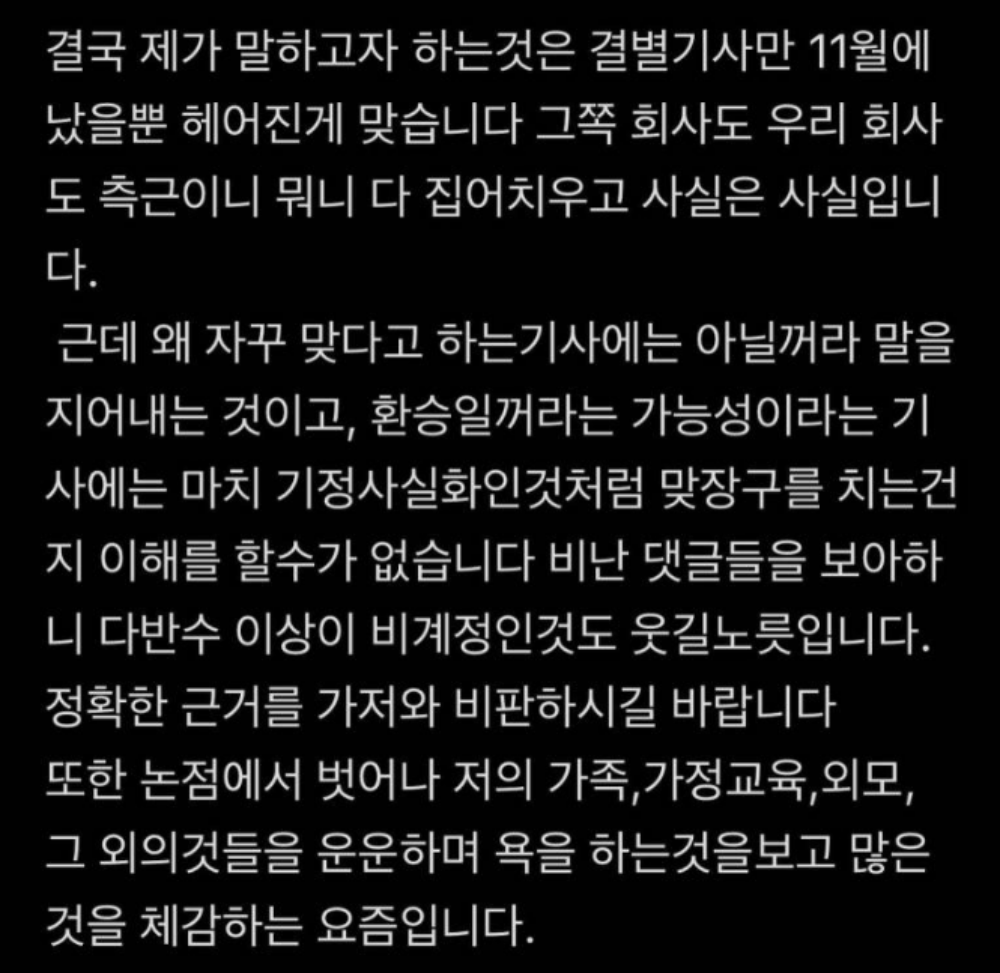 이어 "2023년 11월 사진전에서 처음 만났다. 그 전부터 친분이 있었네라는 말도 안되는 댓글들은 무시하겠다. 공식, 사석에서도 만난 적도 연락을 취하거나 중간에 아는 사람도 일절 없었을 뿐더러 집에 있는 곰인형도 2021년 카카오톡 선물하기로 구매했다."면서 환승연애에 대한 의혹에 다시 반박했습니다.