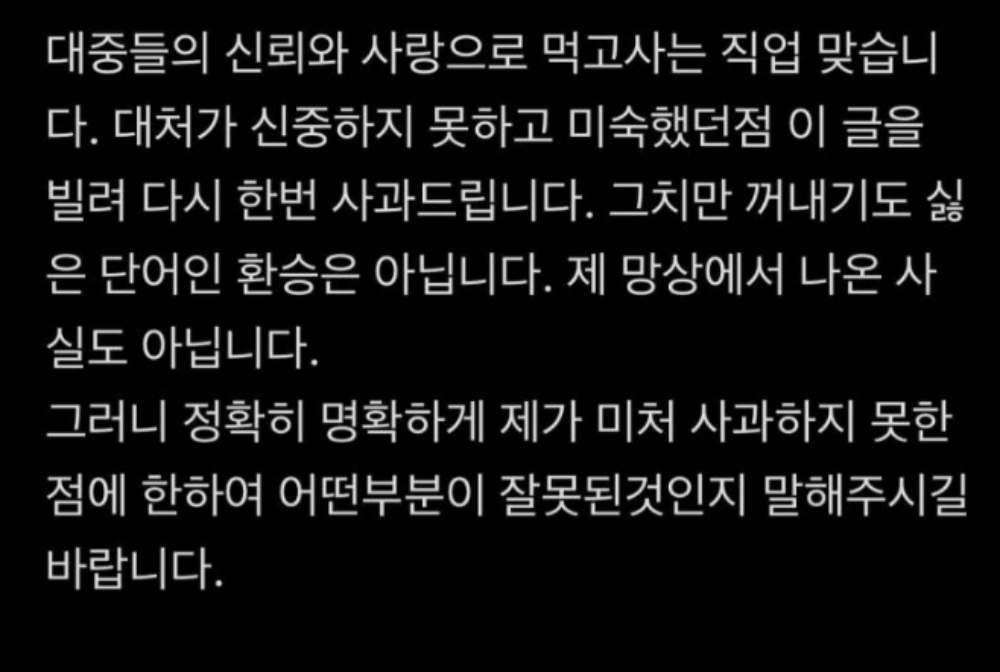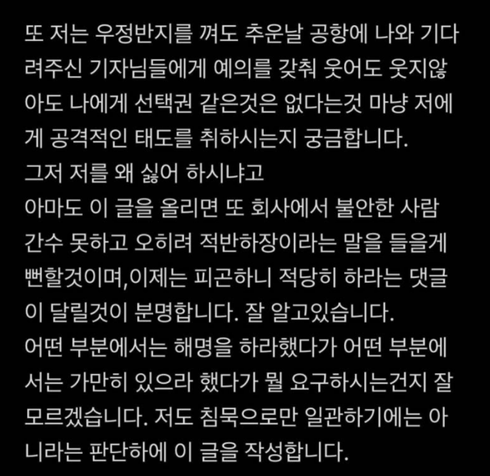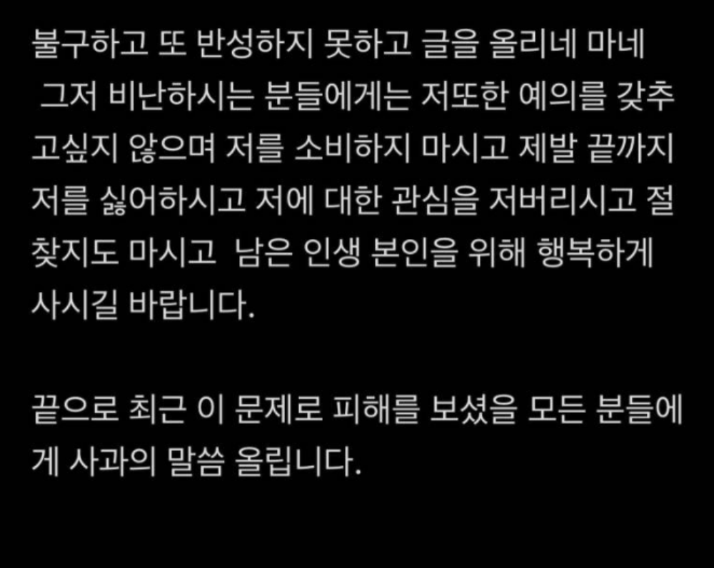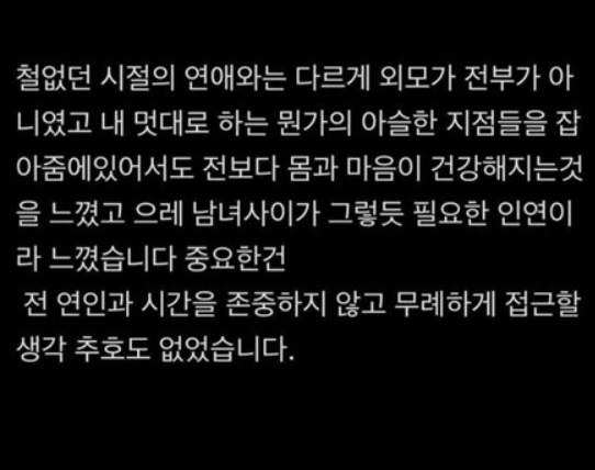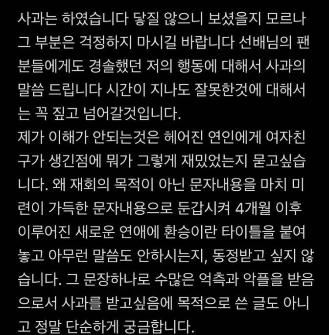 또 "재회의 목적이 아닌 문자 내용을 미련이 가득한 문자내용으로 둔갑시켜 4개월 이후 이뤄진 새로운 연애에 환승이라는 타이틀을 붙여놓고 아무런 말씀도 안 하시는지, 동장받고 싶지 않다. 그 문장 하나로 수많은 억측과 악플을 받음으로써 사과를 받고 싶은에 목적으로 쓴 글도 아니고 정말 단순하게 궁금하다"라고 보다 직접적인 저격도 더했습니다.