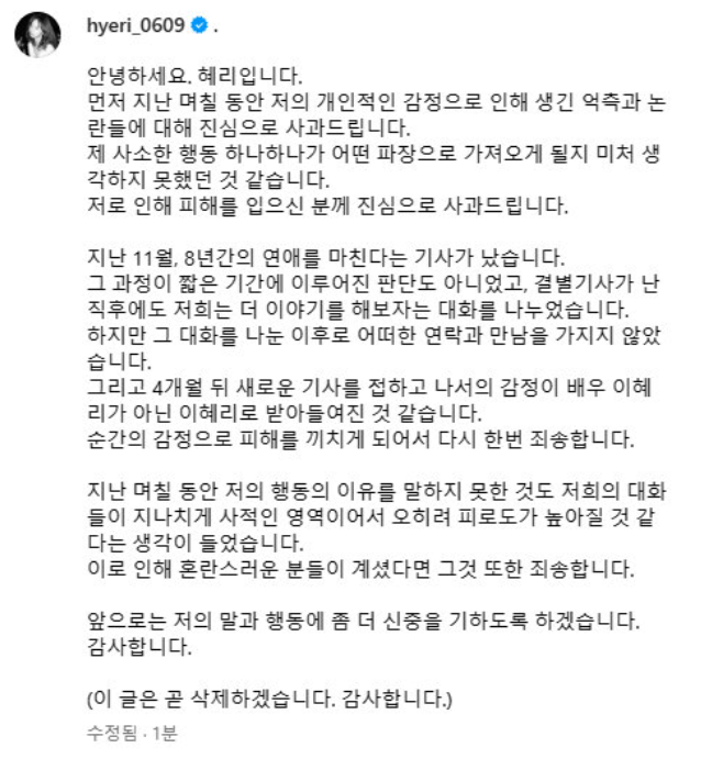 "정확히 작년에 헤어진 것이 맞다. 서로의 안녕과 건강을 빌며 끝으로 마지막 인사를 한 것이 사실"이라면서 "그렇지만 선배님(혜리) 사과문에 적힌 11월에 만나자 한 것은 제가 당사자가 아니라 말할 순 없지만 재회를 목적으로 만나자고 한 것이 아니다"라고 말했습니다.