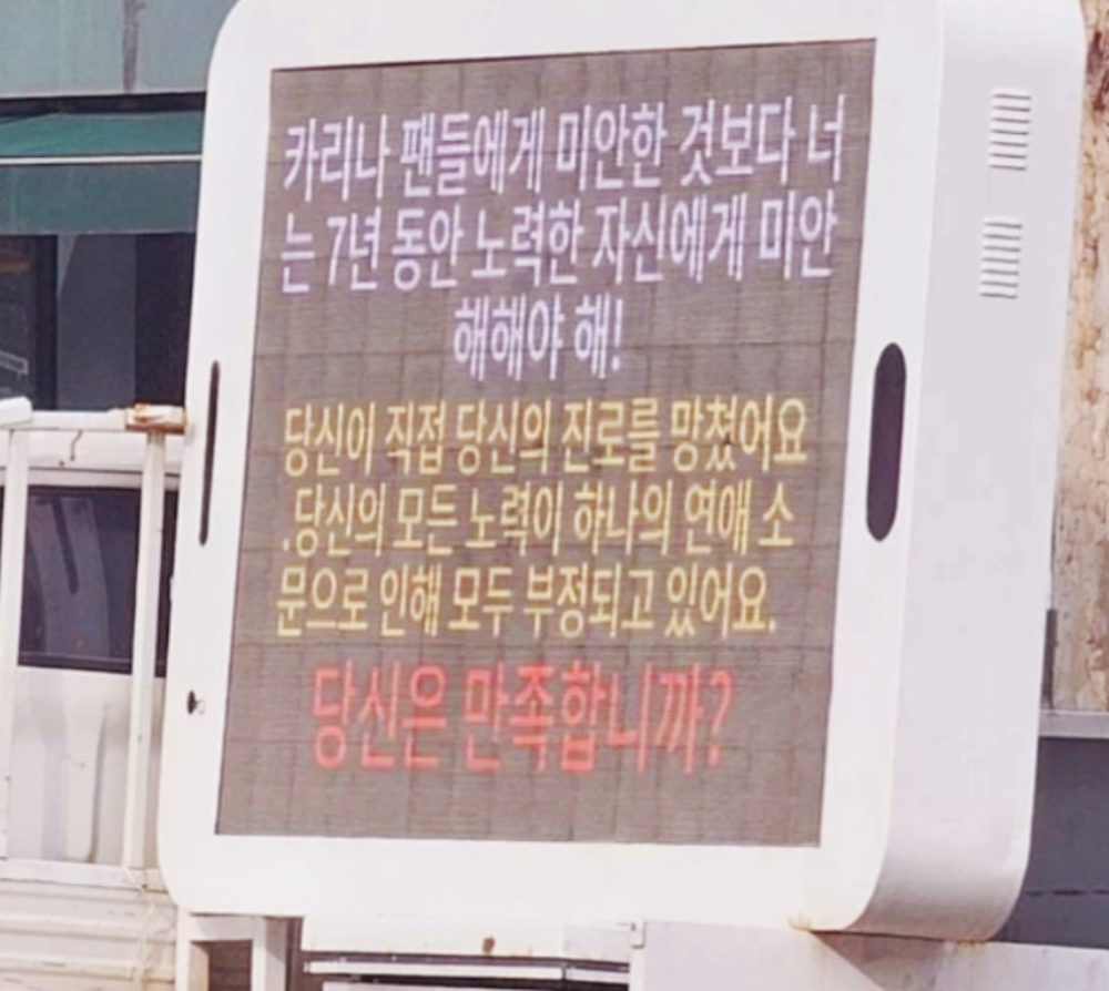 SM엔터테인먼트 인근에 팬들이 보낸 '시위트럭'까지 등장했습니다. 이 때문에 SM 사옥 앞에서는 팬들 사이 항의와 언쟁까지 벌어진 것으로 알려졌죠. 트판에는 "팬이 너엑 주는 사랑이 부족한가. 왜 팬을 배신하기로 선택했냐"라며 "사과해 달라. 그렇지 않으면 하락한 앨범 판매량과 텅 빈 콘서트 좌석을 보게 될 것"이라는 협박성 문구가 적혀있었습니다.