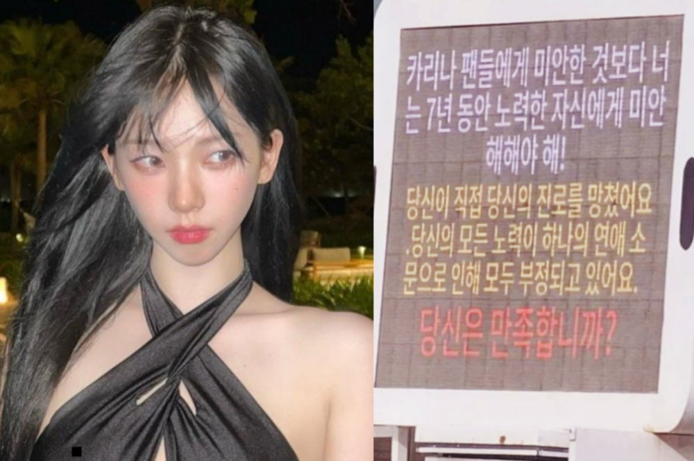 실제로 카리나는 에스파 팬들 중 일부가 트럭시위까지 하면서 카리나의 연애에 "무책임하다"라는 비난을 하는 바람에 심적으로 큰 부담을 가진 것으로 알려졌습니다. 성난 팬들을 달래기 위해 자필 사과문까지 공개했지만 팬들은 여전히 "배신이다"라고 강경하게 맞섰죠.