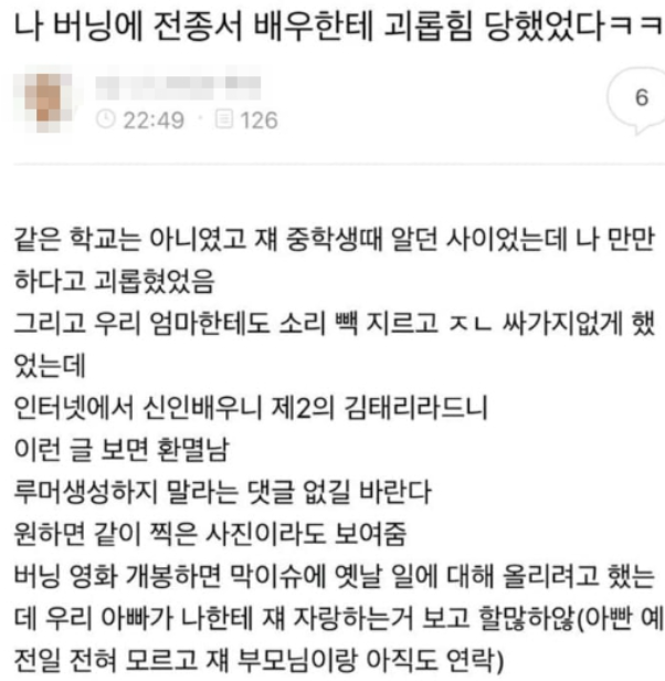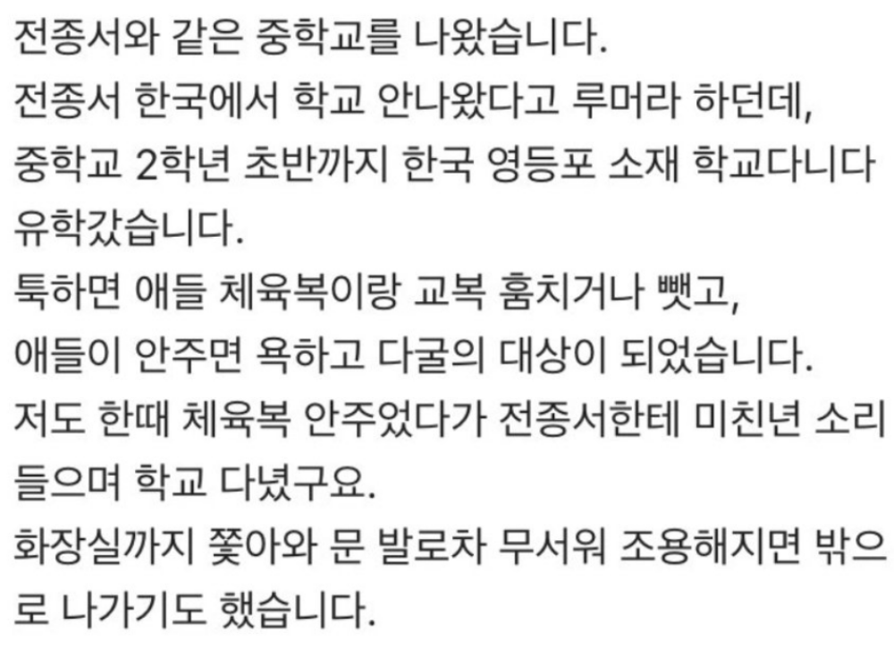 한편 또 다른 온라인 커뮤니티에는 전종서와 초등학교 동창임을 주장하는 제보자도 등장했습니다. 게시글에 의하면 전종서의 학폭 수위는 상상 그 이상입니다. 게시글에는 "애 중학교때 일진이었다. 얘네 무리한테 다굴 당해서 엄청 맞았다. 그때 남자 선배한테 강간하라고 시켜서 당할 뻔했는데 그 오빠들이 그냥 보내주라고 했다. 운이 좋았다"라는 충격적인 폭로가 있었습니다.