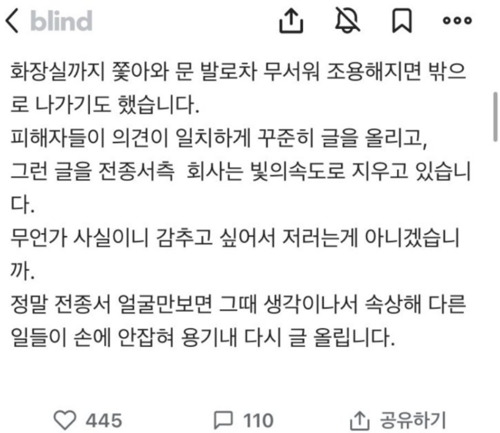 이어 "피해자들이 꾸준히 글 올리는데 빛의 속도로 지우고 있다. 얼굴만 보면 그때 생각이 나 속상해 용기내 다시 글 올린다"면서 전종서의 소속사 측에서 학폭 관련 폭로글을 삭제하고 있다는 주장도 덧붙였습니다.