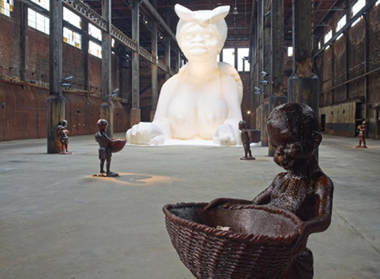 이렇듯 현대 사회가 지니고 있는 수많은 담론들을 한 편의 그림자 연극을 보여주듯 전달하는 카라 워커가 2014년에는 조금 특별한 방식으로 작품을 표현했는데요. 뉴욕의 오래된 설탕 공장에 10.5m 크기의 설탕으로 만든 거대한 흑인 여성 조각을 설치한 것입니다.