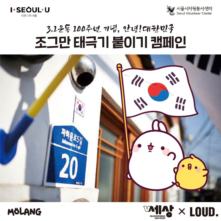 2019년 3월에는 서울시 자원봉사센터와 함께 3.1운동 100주년을 기념해 '조그만 태극기 붙이기'캠페인을 전개하기도 하였습니다. 특히 3월 1일에는 시청광장 캠페인 부스에서 태극기 스티커를 무료로 배부하기도 했는데요. 당시 행사에는 '몰랑이와 함께하는 태극기 그리기' 프로그램도 마련되어 가족 단위 시민들에게 큰 호응을 얻었습니다.
