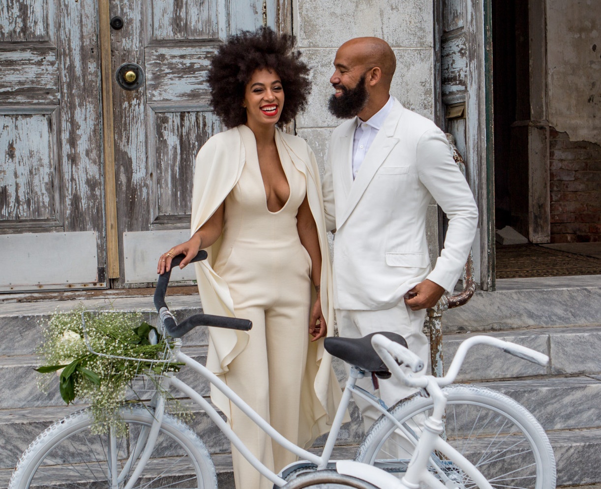 비욘세의 동생으로 유명한 솔란지 노울스 역시 결혼식 예복으로 화이트 점프수트를 선택해 이슈가 되었는데요. 자전거를 타고 결혼식장에 등장하는 등 남편인 앨런 퍼거슨 감독의 연출로 특별하고도 아름다운 결혼식을 진행하기도 했습니다.