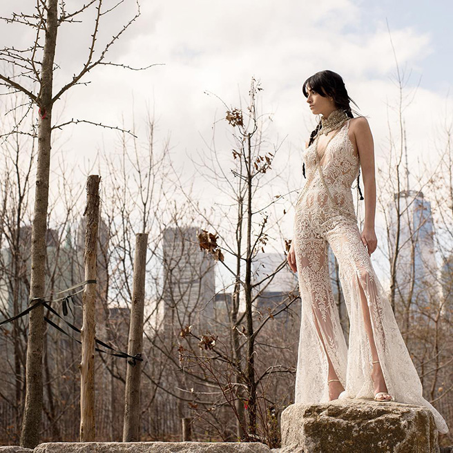 과감한 레이스 소재를 사용한 이 도발적인 웨딩룩은 란제리인지 드레스인지 분간이 어렵기까지 하네요.