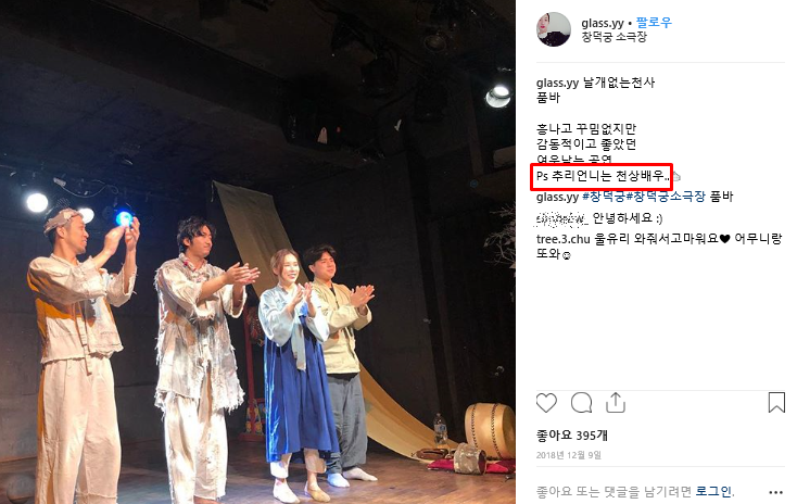 또 그녀의 인스타그램에서는 특별한 인맥을 찾아볼 수 있었는데요. TV조선 '미스 트롯'에 출연해 뮤지컬계의 품바 여신으로 불리는 김추리와의 친분입니다. 염유리의 인스타그램에는 김추리의 품바 공연을 관람한 인증샷과 후기도 게재되어 있지요.