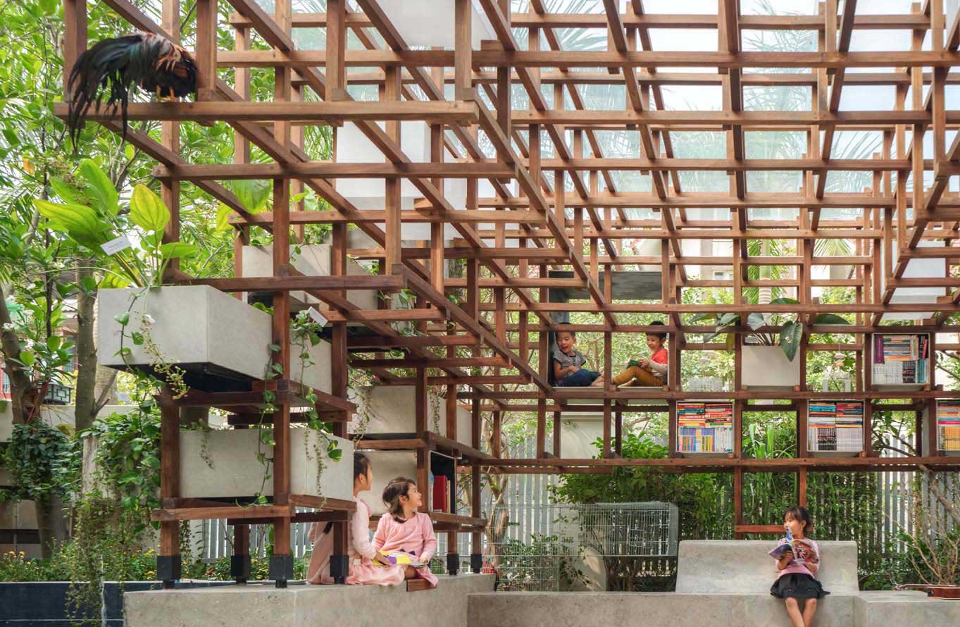 최근 베트남 하노이에는 집안에 작은 규모의 자연을 끌어들이는 방식이 유행인데요. VAC 도서관 역시 건축에 자연을 조합하는 방식을 사용했습니다. VAC는 정원을 뜻하는 베트남 단어인 '브언'과 연못을 뜻하는 '쭈엉'에서 앞 글자를 따온 것인데요. 이름 그대로 수중재배에 중점을 두고 디자인했다고 하네요. 특히 목재 프레임이 눈에 띄는데요. 체계적으로 이루어진 목재의 짜임새는 유연하고 융통성 있는 구조물을 만들어내기에 충분한 재료가 되었습니다. 덕분에 어린이들은 VAC 도서관을 통해 놀이와 독서, 친환경 교육을 한자리에서 누릴 수 있게 되었지요.