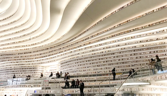 중국 톈진 빈하이 신구에 위치한 이 도서관은 2017년 개장했는데요. 외관의 모습이 눈동자를 닮았다고 해서 '빈하이의 눈'으로 불리기도 합니다. 5층 높이로 지어진 이 도서관은 총 120만 권의 장서를 보유할 수 있다고 하는데요. 특히 바닥에서 천장까지 벽 전체를 둘러싸고 있는 책장은 보기만 해도 엄청난 스케일을 자랑합니다. 로비 가운데 위치한 공 모양의 구조물은 실제 사용하는 공간인데요. 110명을 수용할 수 있는 강당이라고 합니다. 그 외에도 자유롭게 앉아 책을 읽을 수 있는 공간과 함께 사무실, 컴퓨터와 오디오실, 옥상 테라스 등이 있습니다.