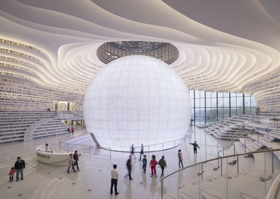 중국 톈진 빈하이 신구에 위치한 이 도서관은 2017년 개장했는데요. 외관의 모습이 눈동자를 닮았다고 해서 '빈하이의 눈'으로 불리기도 합니다. 5층 높이로 지어진 이 도서관은 총 120만 권의 장서를 보유할 수 있다고 하는데요. 특히 바닥에서 천장까지 벽 전체를 둘러싸고 있는 책장은 보기만 해도 엄청난 스케일을 자랑합니다. 로비 가운데 위치한 공 모양의 구조물은 실제 사용하는 공간인데요. 110명을 수용할 수 있는 강당이라고 합니다. 그 외에도 자유롭게 앉아 책을 읽을 수 있는 공간과 함께 사무실, 컴퓨터와 오디오실, 옥상 테라스 등이 있습니다.