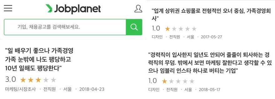 최근 논란과 더불어 전 직원들의 회사 평가가 화제가 되고 있기도 합니다. 잡플래닛에 올라온 리뷰에 따르면 '전형적인 오너 중심, 가족경영회사', '경영진 네 분(가족)만 잘났고 직원들은 모두 못난이 취급당함', '가족경영, 가족 눈밖에 나도 팽당하고 10년 일해도 팽당한다.', '경력직이 입사한지 1년도 안되어 줄줄이 퇴사하는 경력직의 무덤' 등 가족 경영과 경영 능력 부재에 대한 부정적 평가가 많은데요. 공식적으로 밝히진 않았으나 전 직원들의 증언에 따르면 대표와 상무 부부 외에 박준성 대표의 어머니가 경영진으로 참여하고 있으며 임상무의 여동생도 회사 내 경영에 개입하고 있는 것으로 보입니다.