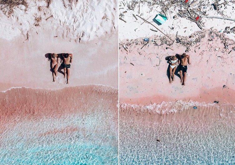 최근 그들은 인도네시아 코모도 핑크 해변을 다시 찾았는데요. 1년 전과 정확히 같은 장소에서 같은 포즈로 사진을 찍었지요. 그리고 2019년 4월 22일 지구의 날에 두 사진을 비교하여 공개했습니다. 공개된 사진은 다소 충격적인 모습인데요.