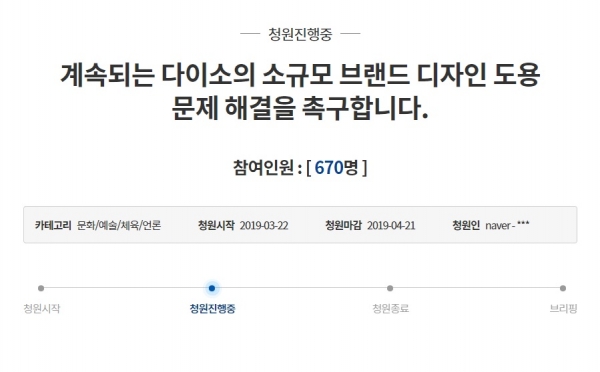 다이소의 이러한 안일한 대응으로 인해 청와대 국민청원 홈페이지에는 '계속되는 다이소의 소규모 브랜드 디자인 도용 문제 해결을 촉구합니다'라는 제목의 청원이 등장하기도 했는데요. 해당 게시물의 댓글에는 자신을 동종업계 관계자로 소개한 익명의 네티즌이 '다이소는 지난 2월에도 마스킹 테이프를 표절했다. 당시 납품 업체 측은 해당 제품을 전량 폐기, 회수한 뒤 협의했지만 이는 다이소 측에 면죄부가 될 수 없다.'라고 밝히기도 했습니다.