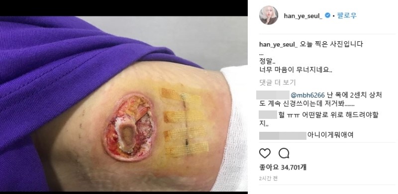 지난 2018년 4월 배우 한예슬은 자신의 SNS를 통해 지방종 제거 수술 중 의료사고를 당해 겨드랑이 및 옆구리 부분에 큰 흉터가 생긴 사실을 호소했는데요. 20일 처음으로 '지방종 제거 수술을 받다가 의료사고를 당했다. 수술한 지 2주가 지났는데요 병원에서는 보상에 대한 얘기는 없고 매일매일 치료를 다니는 제 마음은 한없이 무너진다. 그 어떤 보상도 위로가 될 것 같진 않다.'라는 글과 함께 수술 부위를 찍은 사진을 직접 공개했습니다. 이후 23일 추가로 환부 사진을 공개하며 '정말 마음이 무너지네요'라는 글을 남겼는데요.