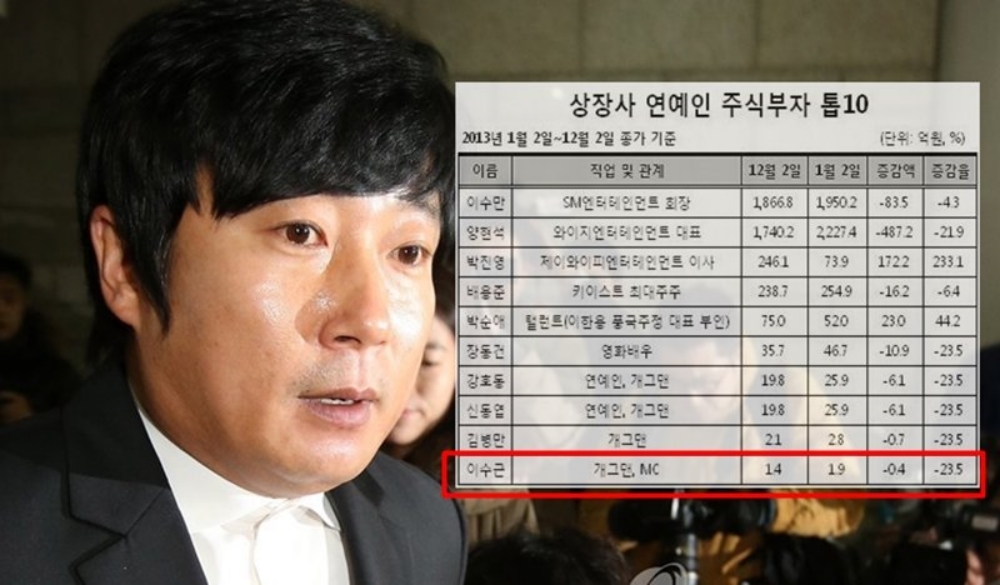 더불어 이수근은 2012년 자신의 자산은 32평 아파트와 자가용 그리고 저축뿐이라고 말했는데, 2013년 연예인 주식부자 순위 10위에 오르면서 논란이 되기도 했습니다. 이는 재벌닷컴에서 발표한 자료 가운데 이수근이 보유한 SM C&C의 주식 평가액 1억 4000만 원 때문이었는데, 당시 1위를 차지한 이수만 회장의 주식 평가액이 1866억 원 이상인 것을 감안하면 큰 액수가 아니었지만 그 시기 이수근의 도박 혐의가 밝혀지면서 논란이 가중된 것.